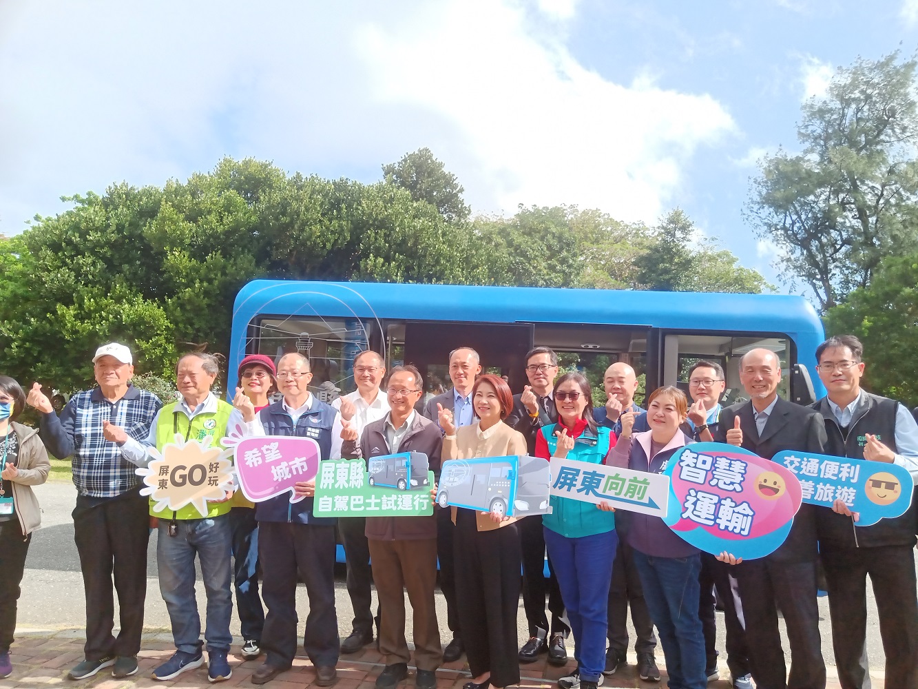 屏東自駕巴士在墾丁國家森林遊樂辦理試運行,屏東縣長周春米21日搶先試乘體驗,歡迎民眾2月22日至3月7日預約體驗全新智慧交通運輸工具。(屏東縣政府提供)