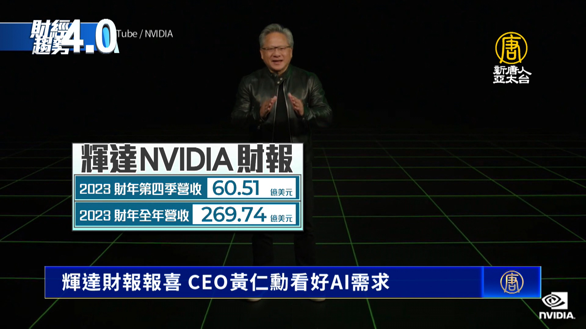 【新唐人亞太台 2023 年 02 月 25 日訊】輝達公布2023財年第四季與全年財報,表現優於市場預期,激勵盤後股價飆漲,執行長黃仁勳在財報會議上也釋出看好AI晶片需求的展望。