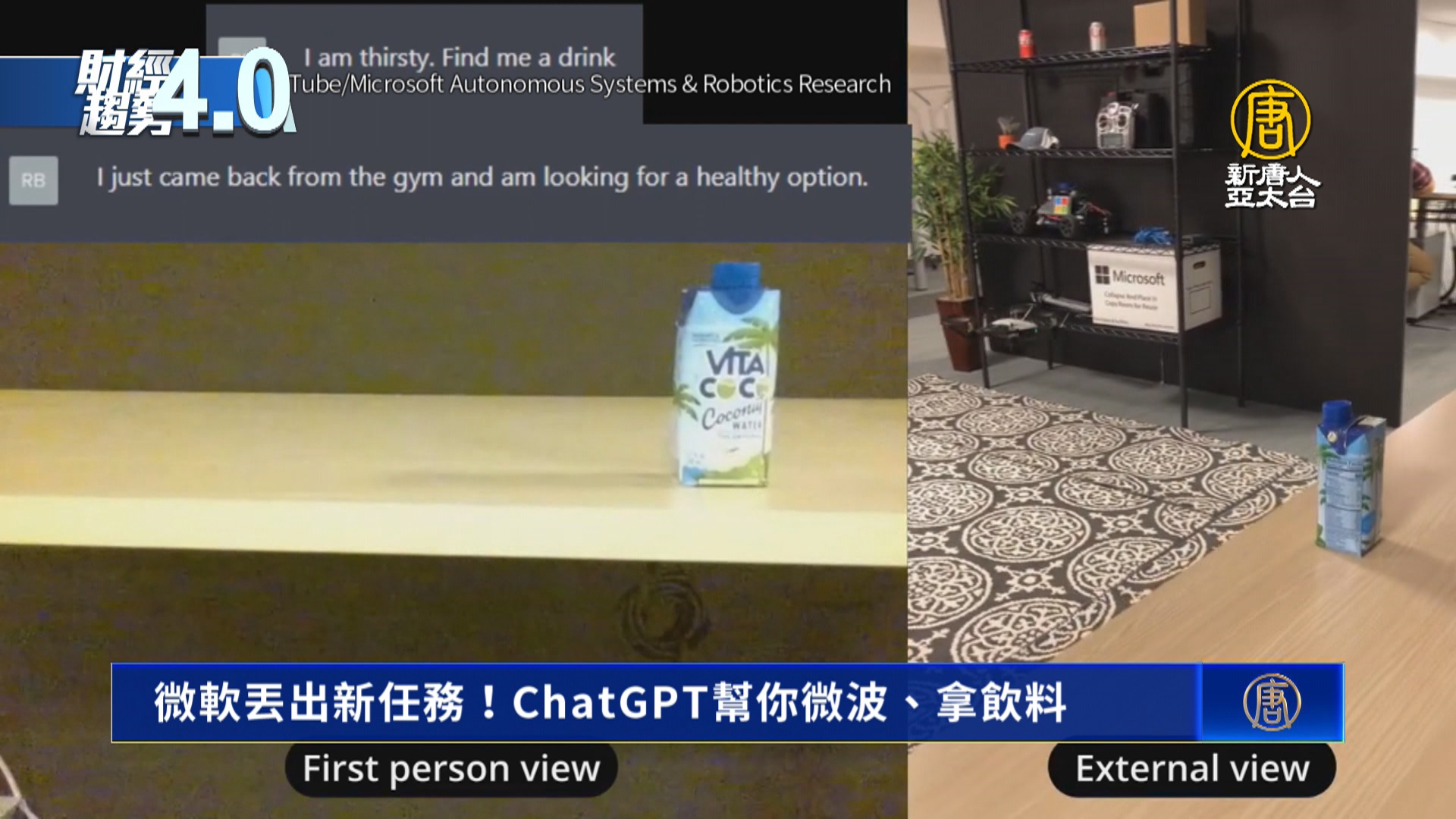 【新唐人亞太台 2023 年 03 月 04 日訊】歡迎回來。AI聊天軟體ChatGPT現在說不定也能協助幫你拿飲料!美國科技巨頭微軟,不僅推出整合AI技術的搜尋引擎,現在也在研究測試,如何透過AI語言模型對機器人下達指令。