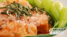 3. 另起一鍋,鍋中放入開水、味醂、醬油,關火。加入炸過的蒸蛋收汁盛盤。盤邊可放青江菜當盤飾。最後撒上七味子、鹽、柴魚片、海苔絲即可。