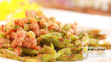 食材:四季豆200克、絞肉60克、蒜末10克、蔥花20克。