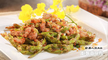 1. 起一油鍋,於油鍋放入四季豆油炸至熟透(用筷子可以壓扁即熟了)撈起,將油溫拉高,再把四季豆回炸一下,瀝油備用。