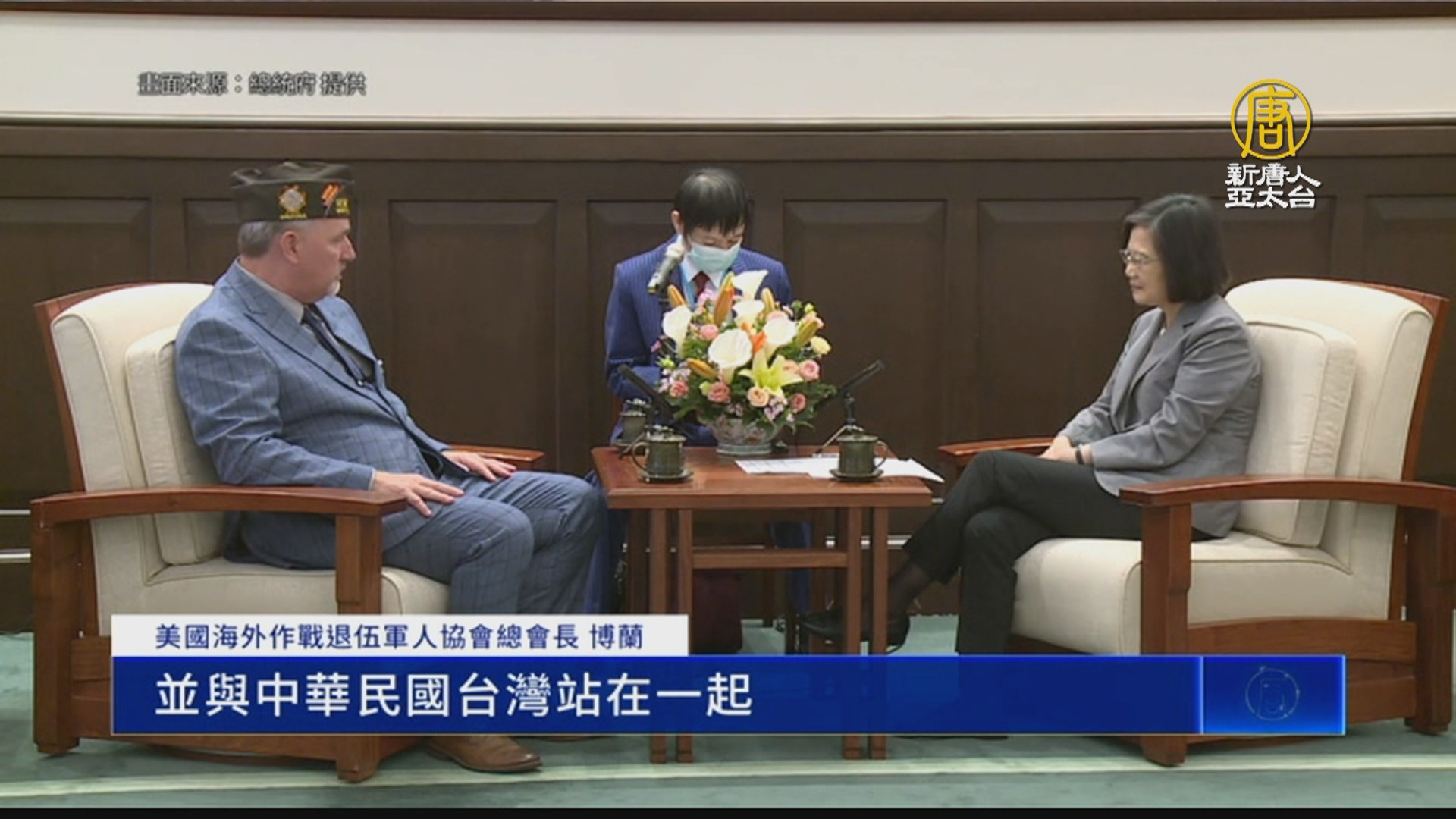 【新唐人亞太台 2023 年 05 月 15 日訊】中華民國總統蔡英文今天(15日)在總統府接見美國海外作戰退伍軍人協會訪團,台灣駐美代表處去年成立了退伍軍人事務組,蔡總統期待台美交換豐富經驗,一起增進退伍軍人福利。訪團代表、協會總會長博蘭(Timothy Borland)表示,與中華民國、台灣站在一起。