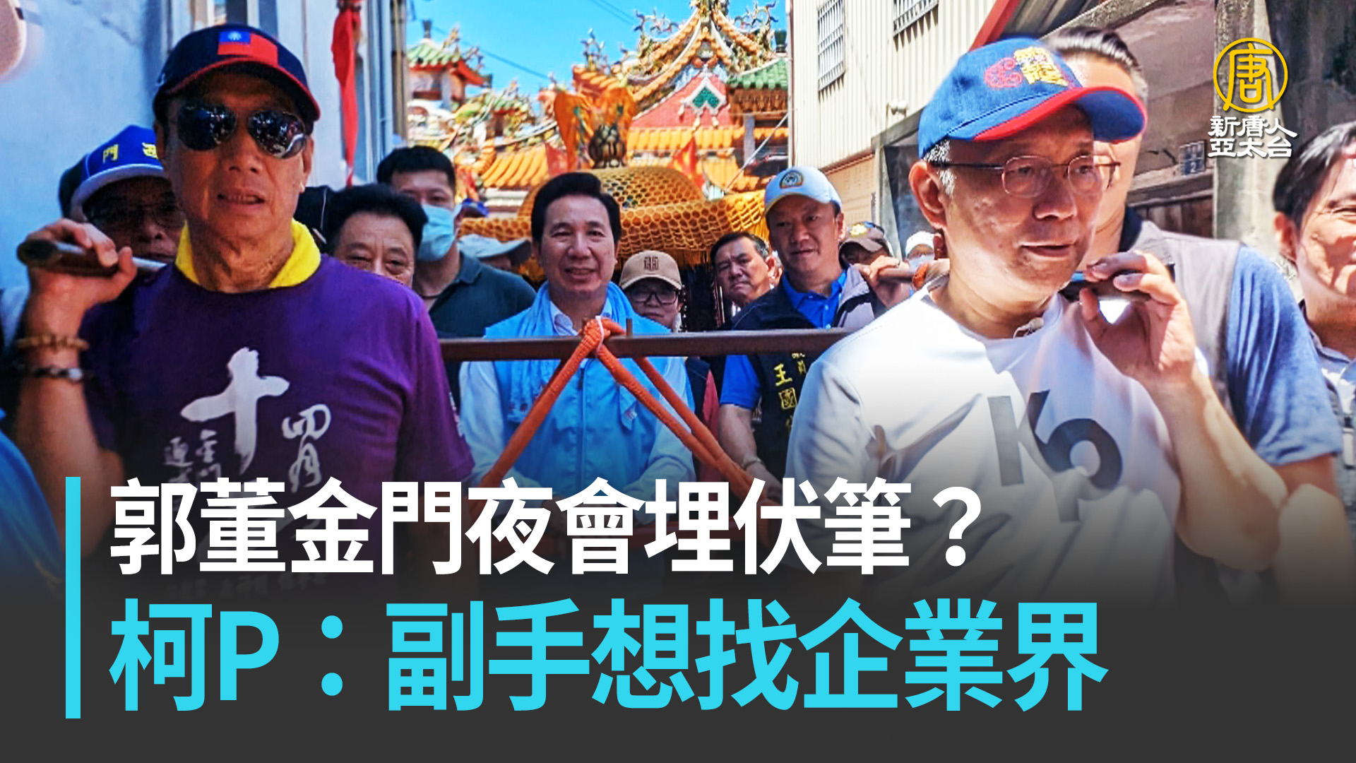 【新唐人亞太台 2023 年 05 月 31 日訊】總統大選攻防,副總統賴清德、民眾黨主席柯文哲、鴻海創辦人郭台銘,昨天30日都前往離島金門,柯文哲與郭台銘3度同框,昨晚還一起夜遊小金門,讓「郭柯配」的想像再成話題。不過,柯文哲今天透露,副手人選想找企業界,郭董也不會願意當副手。