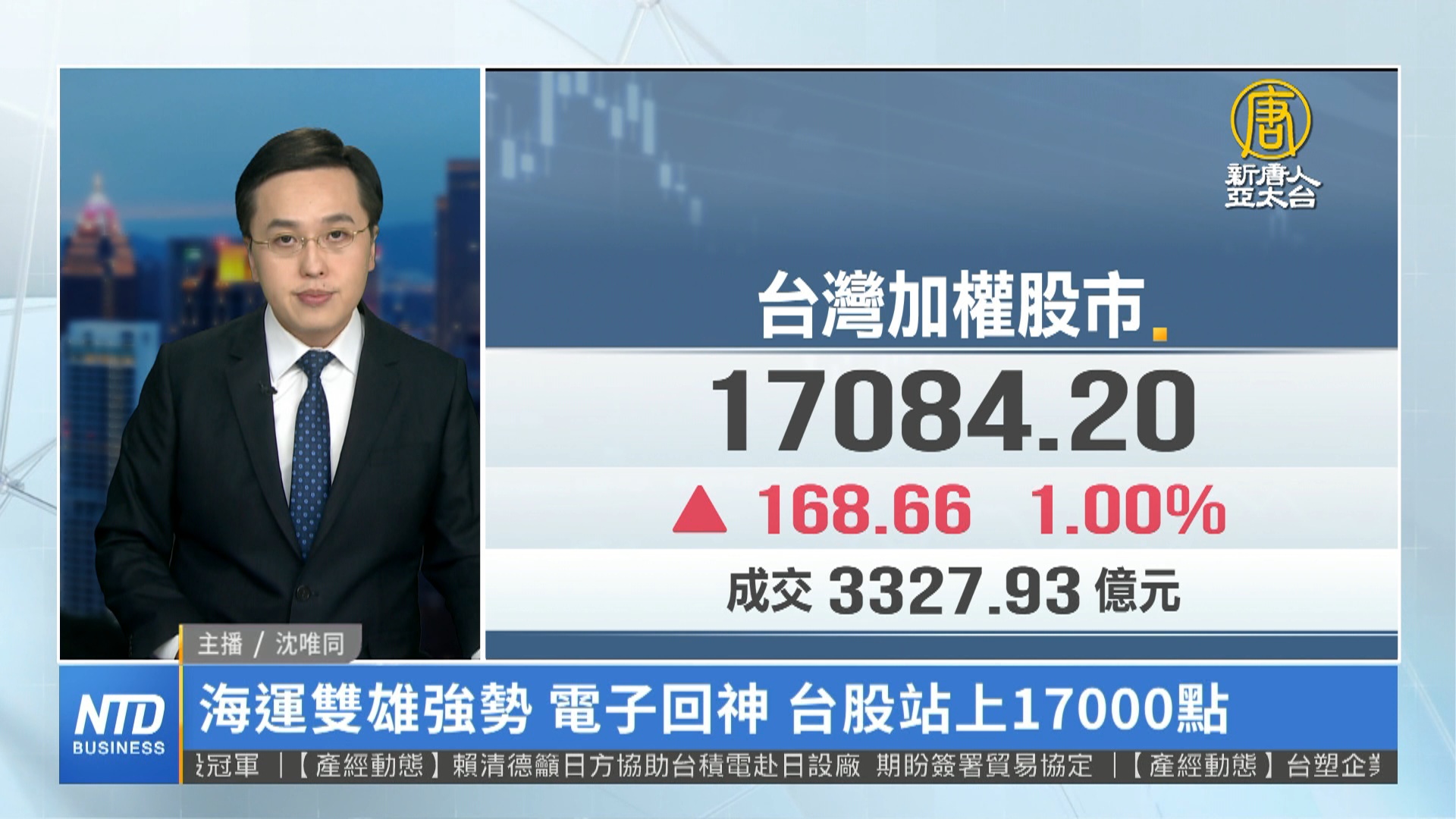 【新唐人亞太台 2023 年 07 月 03 日訊】美國華爾街投資情緒樂觀,看好通膨快速降溫,美股主指週五 (30 日) 全數收紅,蘋果收盤突破每股190.73美元,市值達到突破3兆,也帶動科技股相關表現。台股周一指數強勢反彈,電子五哥、海運雙雄、電源、網通等族群強勢走強,帶動台股一度大漲近200點,儘管盤中漲幅收斂,但台股仍就順勢站上17000點大關,收復5日線並站回月線關卡,成交量3600億。