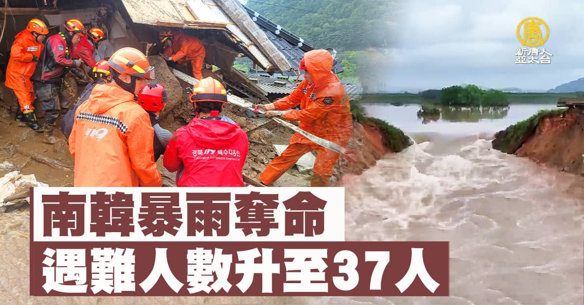 韓國政府週日稱,有37人在洪災中遇難,至少35人受傷。在過去幾天,洪災造成至少27260戶家庭斷電,超過8850人緊急撤離,暴雨損壞或摧毀了近50條道路和100多所房屋。