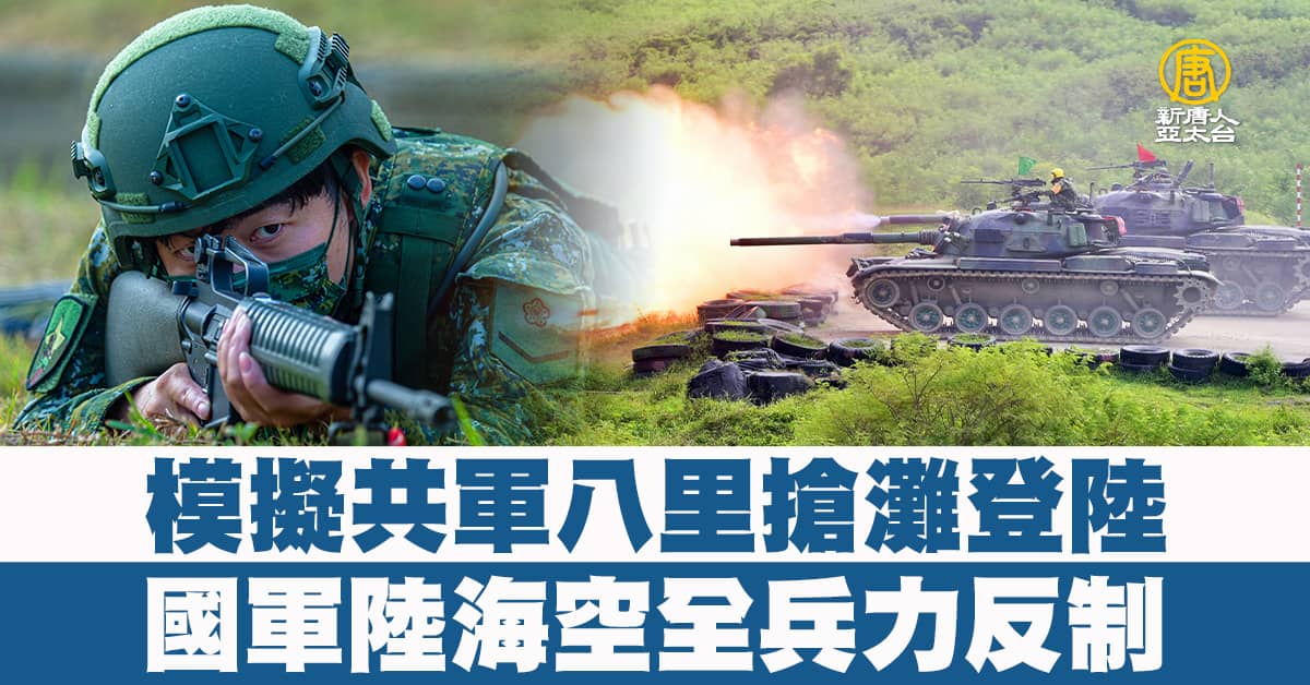 【新唐人亞太台 2023 年 07 月 20 日訊】漢光39實兵操演下週登場,國軍上午在新北市八里北堤海灘,進行反登陸作戰預演,以攻方紅軍乘坐AAV7兩棲突擊載具搶灘登陸為主要想定,守方藍軍則以戰搜無人機、F-16V、快速布雷艇、M60A3戰車、拖式飛彈等陸海空兵力反擊,這也是漢光登場前,最後一次反登陸作戰預演。