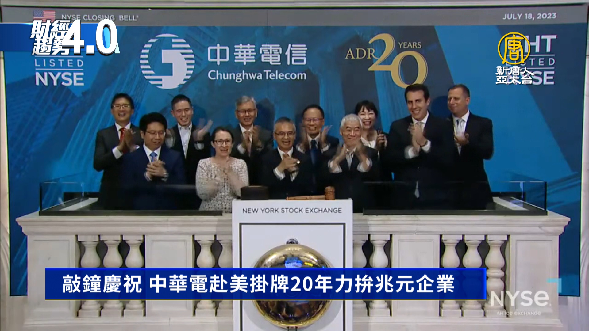 【新唐人亞太台 2023 年 07 月 22 日訊】歡迎回來。中華電信早年是台灣的國營事業,今年適逢美國發行存託憑證上市滿20周年,再次在紐約敲鐘慶祝,董事長郭水義認為,成功在海外釋股,奠定民營化關鍵里程碑,未來集團的經營願景,是朝向兆元規模的科技公司邁進。