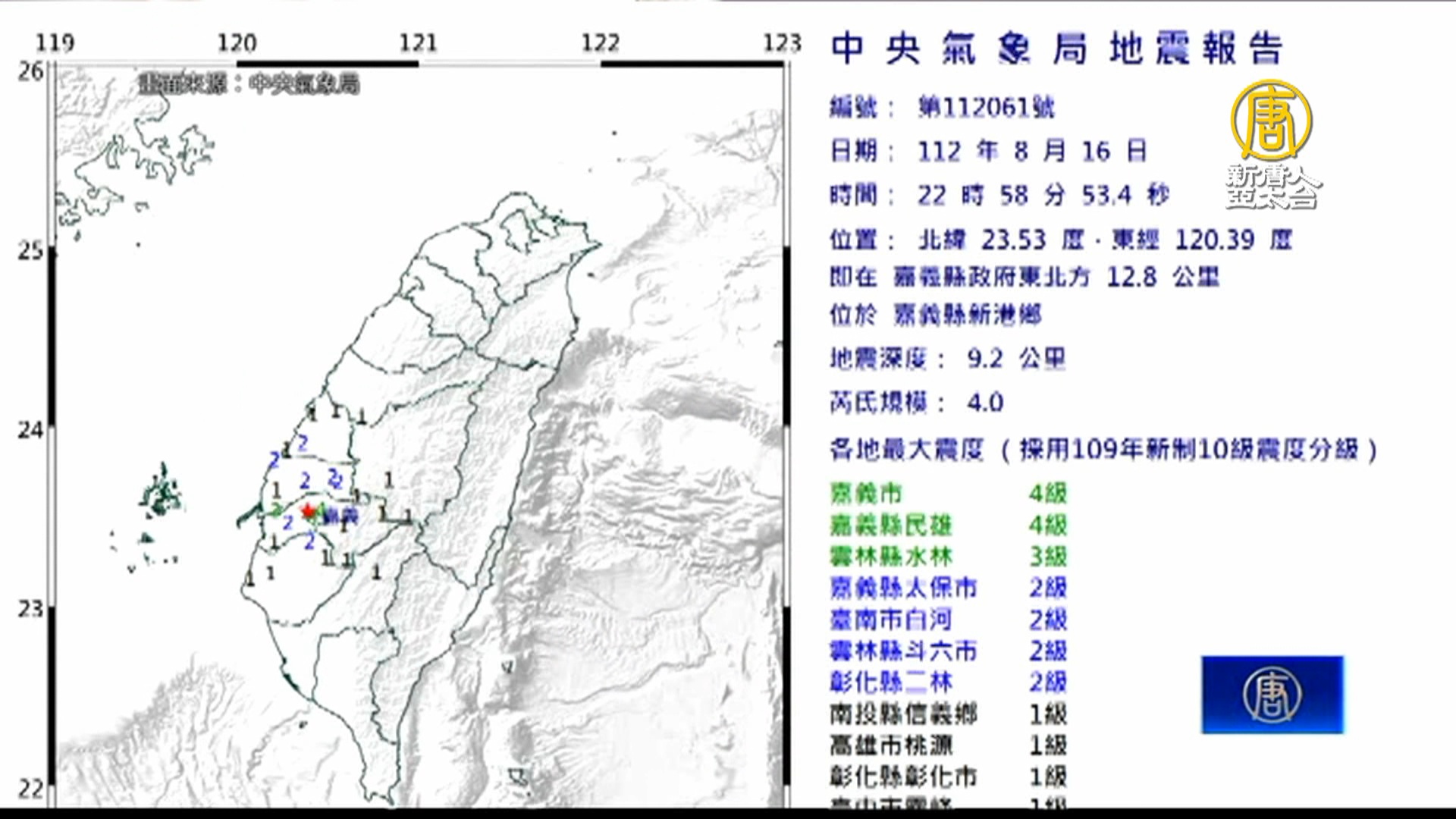 【新唐人亞太台 2023 年 08 月 17 日訊】早安新唐人先帶您關心,嘉義地區昨夜發生規模4.0的極淺層地震,深度只有9.2公里,許多人在睡夢中被驚醒,值得注意的是,這個淺層地震的震央在嘉義縣新港鄉,但最大震度4級卻在嘉義市及嘉義縣民雄鄉,而且影響範圍並不大,以嘉義縣、市為主,雲林縣、彰化縣、南投縣、台中市、高雄市與台南市震度為1到3級。嘉義縣、市消防局指出,這起極淺層地震目前還沒有傳出災情。