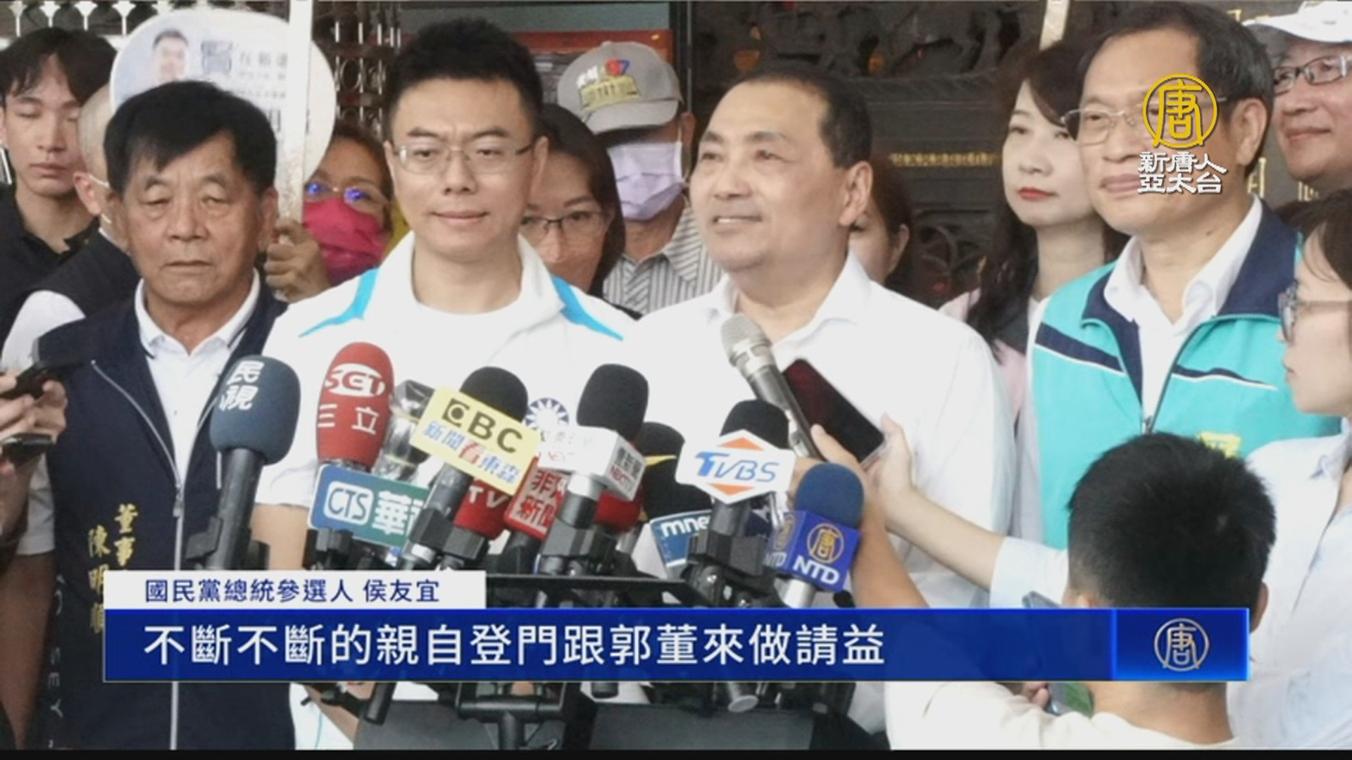 【新唐人亞太台 2023 年 08 月 18 日訊】有意參選總統的鴻海創辦人郭台銘,17日以三隻小豬故事比喻「主流民意大聯盟」,邀請柯文哲、侯友宜合作下架民進黨。國民黨總統參選人侯友宜今天(18日)表示,過去三次登門拜訪不得其門而入,如今郭台銘親自邀約,他願意再次登門拜訪。