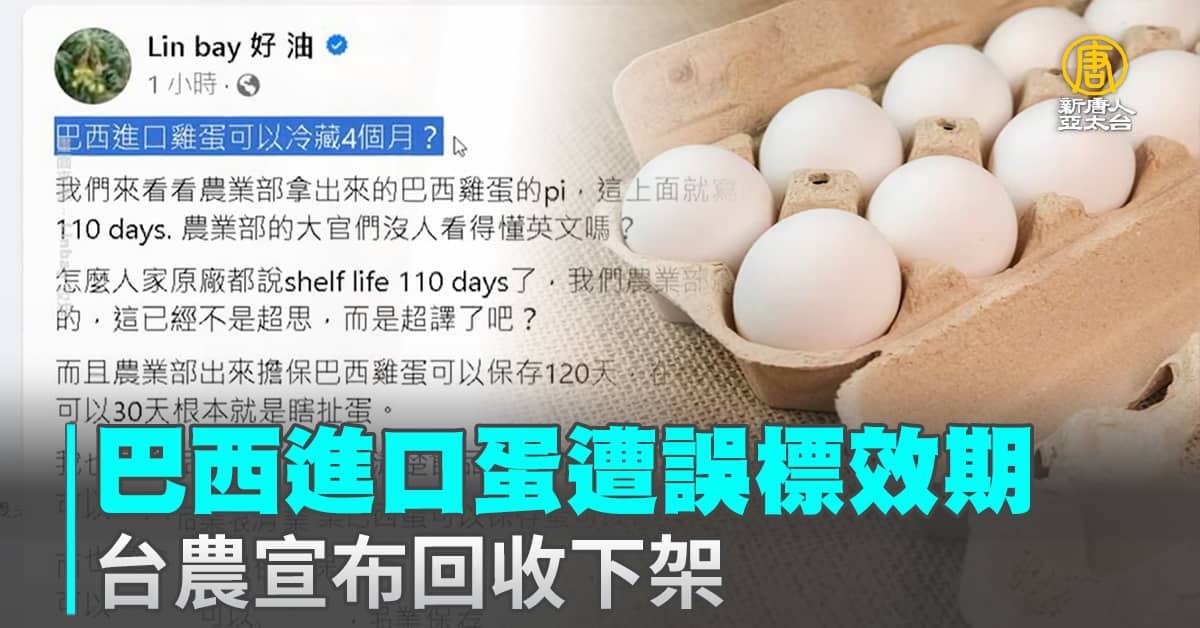 【新唐人亞太台 2023 年 09 月 12 日訊】再來關心,超思進口的雞蛋話題不斷,有Facebook粉專指出,巴西進口的蛋,是5月30日裝箱上船,農業部擔保可以放4個月,但市面上販售的巴西卻寫製造日期是9月5日,保存期限到10月5日,農業部表示,這是廠商誤植製造日期,從巴西進口雞蛋最後一批的有效期限是9月下旬,目前都在有效期內,而洗選廠台農蛋品,今天(12日)發出聲明表示,已將標示錯誤的商品全部回收下架,並向消費者致歉。
