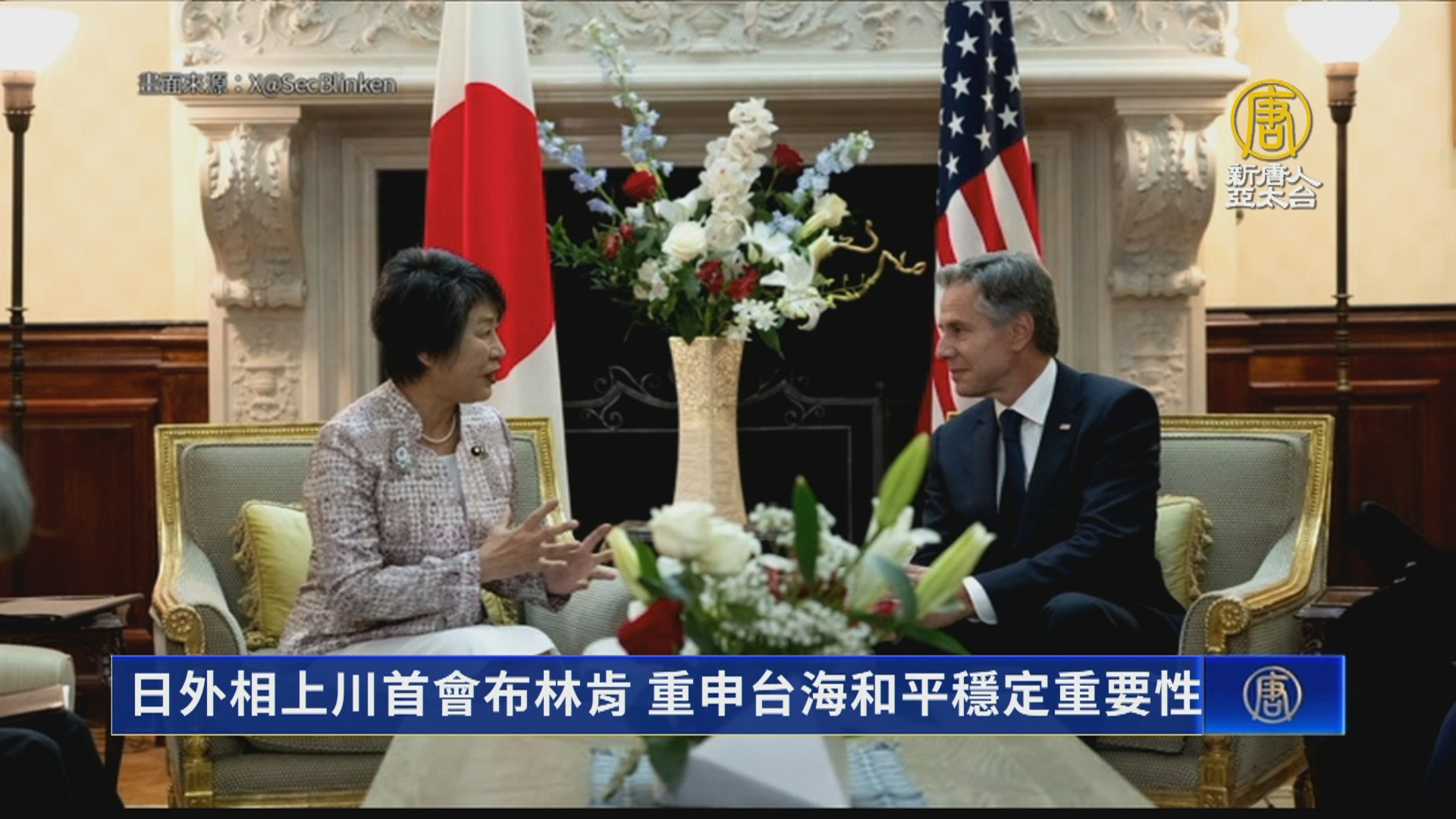 【新唐人亞太台 2023 年 09 月 19 日訊】聯合國大會的場邊,也有多場會談,日本外相上川陽子,18日在紐約與美國國務卿布林肯進行上任後的首次面對面會談。兩國同意繼續在國際社會面臨的許多問題上密切合作,包括俄羅斯入侵烏克蘭、北韓核武以及應對圍繞中共的各種問題。美國國務院發言人聲明表示,布林肯與上川陽子也重申維護台海和平與穩定,以及維護東海和南海國際法的重要性。