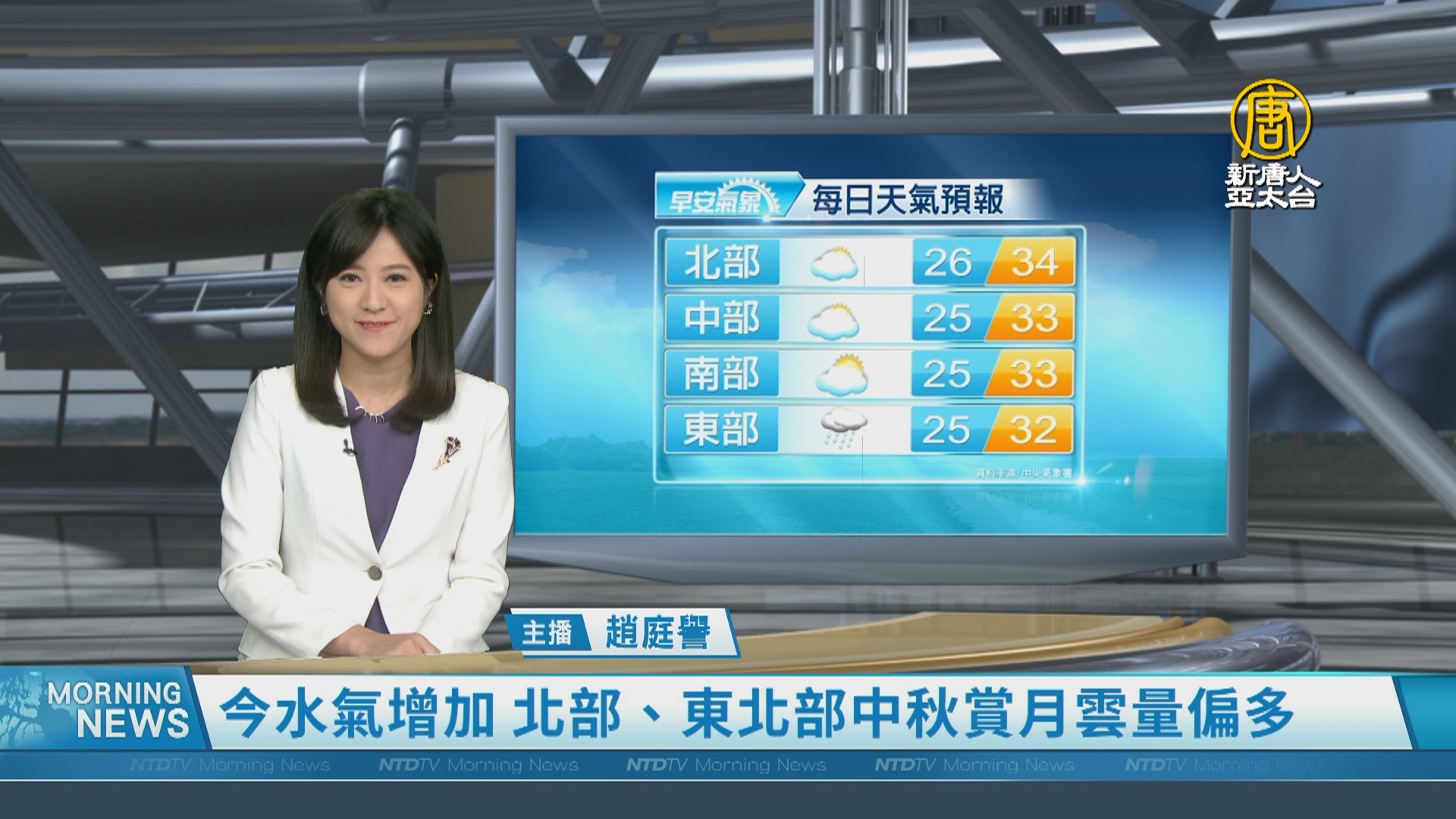 【新唐人亞太台 2023 年 09 月 28 日訊】歡迎您收看9月28日的早安新唐人,我是趙庭譽,先來帶您關心天氣。明天就要迎接一連三天的中秋節假期了,不過,今天開始,台灣附近水氣增多,北部、東北部在中秋節期間可能會「雲中探月」,中南部賞月機會較大。