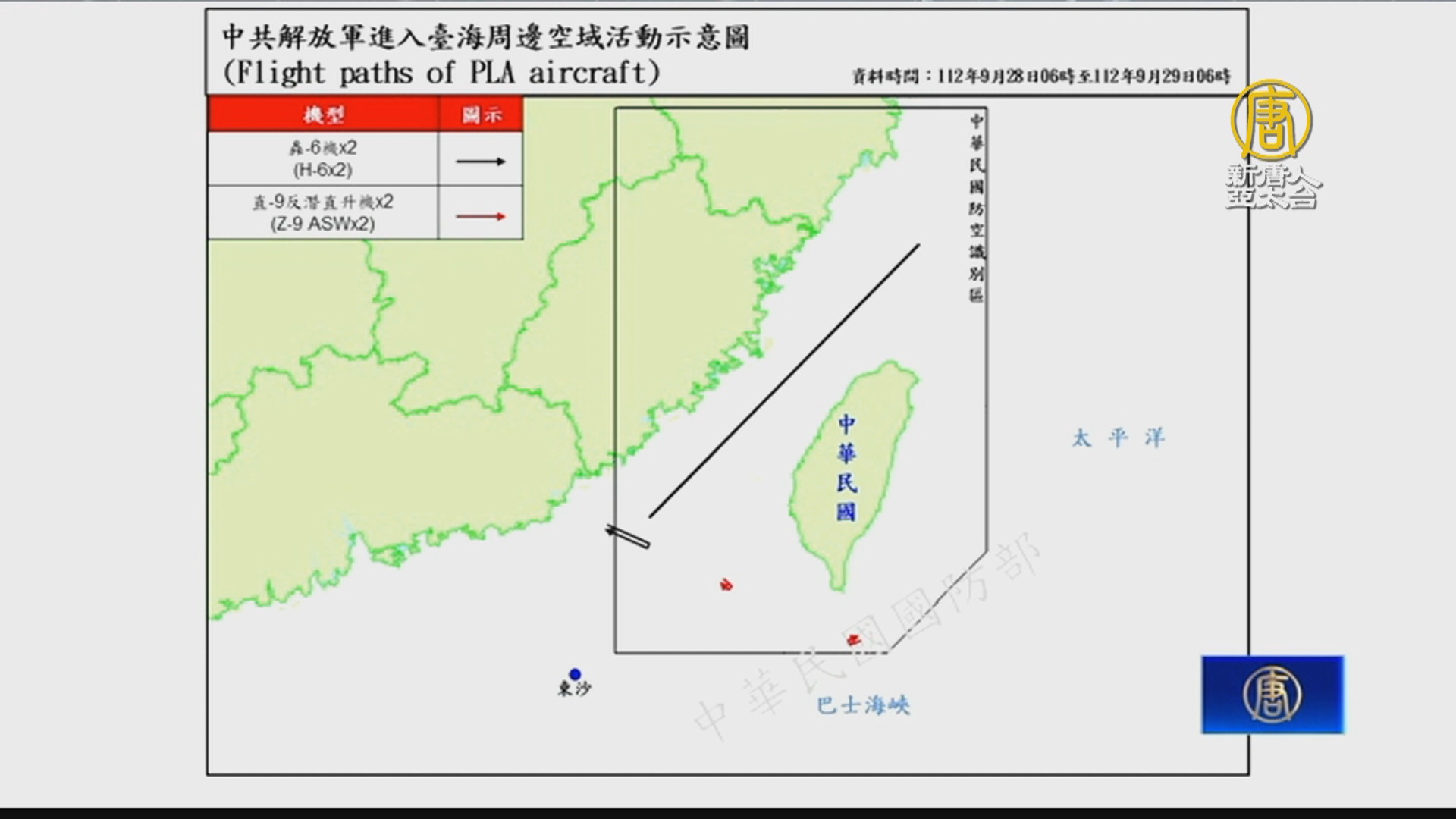 【新唐人亞太台 2023 年 09 月 29 日訊】中秋連假,國軍持續在第一線守護台灣,中華民國國防部表示,截至今天(29日)上午6點,二十四小時內偵獲23架次共機與5艘次共艦在台海周邊活動,其中有四架次轟6、直9反潛直升機闖入台灣防空識別區,國軍運用任務機、艦及岸置飛彈系統嚴密監控與應處。