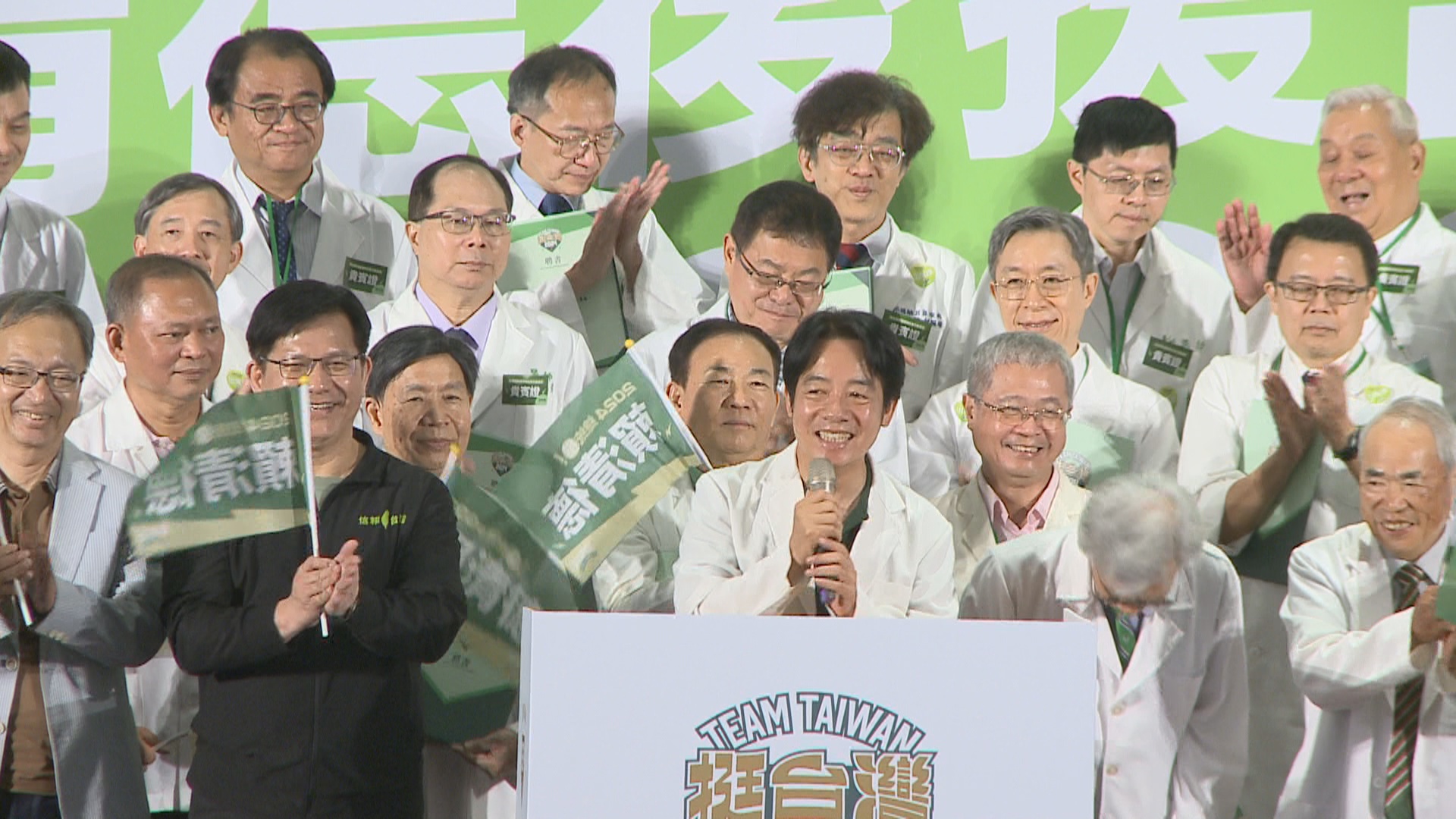 民進黨總統參選人 賴清德:「中共不管是戰機或是船艦,然後飛到台灣的身邊,可以說是每一日都有,任何時候藉各種理由,來合理化它們的行為。」「到底是繼續往前走,走進國際社會,還是說為了要減緩這個壓力衝擊,轉回頭路,接受九二共識、一個中國原則,或者是簽訂和平協議,又或者是乾脆跟它們簽訂服務貿易協定,間接的去接受一個中國的原則,到底要怎麼樣,我希望我們醫界的前輩,在這關鍵的時刻能夠站出來,堅定的跟我們社會大眾講,我們應該要團結在一起,團結就有力量,我們應該不怕各種威脅,不怕各種恐嚇。」