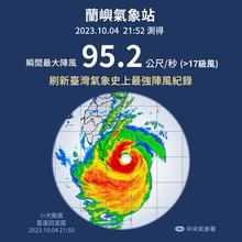 氣象署臉書刊文指出,蘭嶼測得瞬間最大陣風每秒95.2公尺,刷新臺灣氣象史上最大陣風的觀測紀錄!貼文還稱,「由於風力實在太強,蘭嶼氣象站的風速計已經陣亡」。