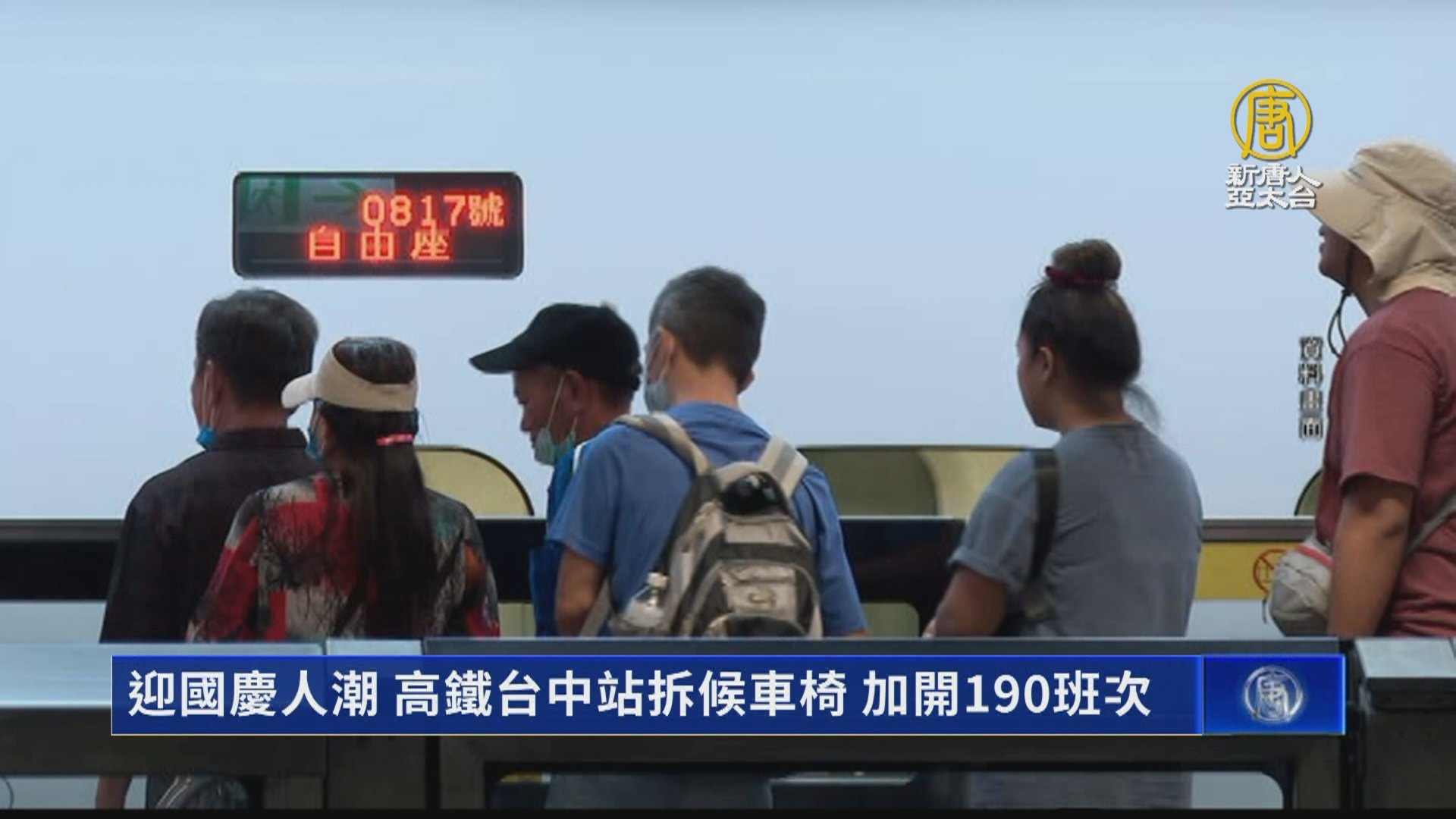 【新唐人亞太台 2023 年 10 月 06 日訊】今年國慶焰火10日在台中的中央公園施放,不過上周末中秋連假收假日,台中高鐵站自由座旅客從站內排到站外,排隊 2小時上不了車,單日運量超過33.8萬人次,創下通車以來最高。國慶連假是否遇到同樣的問題。對此,高鐵表示,因應國慶疏運和人潮,台中站調整付費區內16個座椅位置到動線外,並加開190班次列車。另外,台鐵也在10月9日以及10月10日這兩天,加開12列次,同時推出有總量管制的「全列車自由座」班次,以疏解台中地區的旅客疏運。