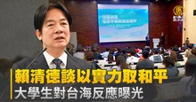 2023-09-26 13:15:36昨天(25日)晚間,民進黨總統參選人、副總統賴清德,到台中東海大學演講,賴清德在回應台海議題時強調,台灣應靠實力取得和平,而非靠和平協議或九二共識。另外,賴清德也請現場學生舉手,了解學子對台海安全的看法。