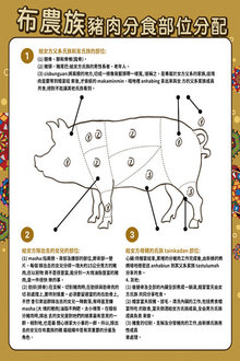 而現場「豬肉分食」是布農族非常具有代表性的文化之一,在傳統歲時祭儀中,豬認分食含有對天的感謝及慶祝儀式圓滿之意;族人會分工合作進行肢解與內臟清洗,處理過程十分嚴謹,豬肉分食是由同氏族之一同完成,是親屬團結的表現,展現布農族重視群體生活的觀念,在嬰兒祭中豬肉分食有回饋母親及親屬之意,這和布農族人重視家族親屬關係有關表示感恩。