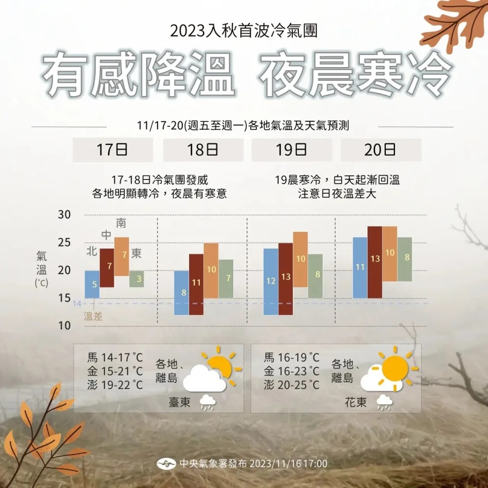 預計這波冷氣團持續影響到週日清晨,最冷的時候會發生於週六跟週日的清晨,北部、中部低溫下探12度到13度,其他地區為14度到15度。週日白天起逐漸回溫,北部高溫攀升至22度到24度,後續以一天1度到2度的幅度回溫,預估下週三(22日)、下週四(23日),北部白天的溫度回到25度到27度,低溫則落在17度到20度。