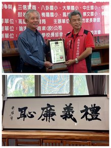 身為鼓岩校友的報關公司負責人莊尚諭表示,感恩高雄市家長聯盟達成他與媽媽的共同心願,這種促成名家墨寶與校園品德相互奔赴的模式,希望大家重視寫書法,能讓文化傳承與「禮義廉恥」對接弘揚品德,這次參與希望拋磚引玉繼續推動下去。