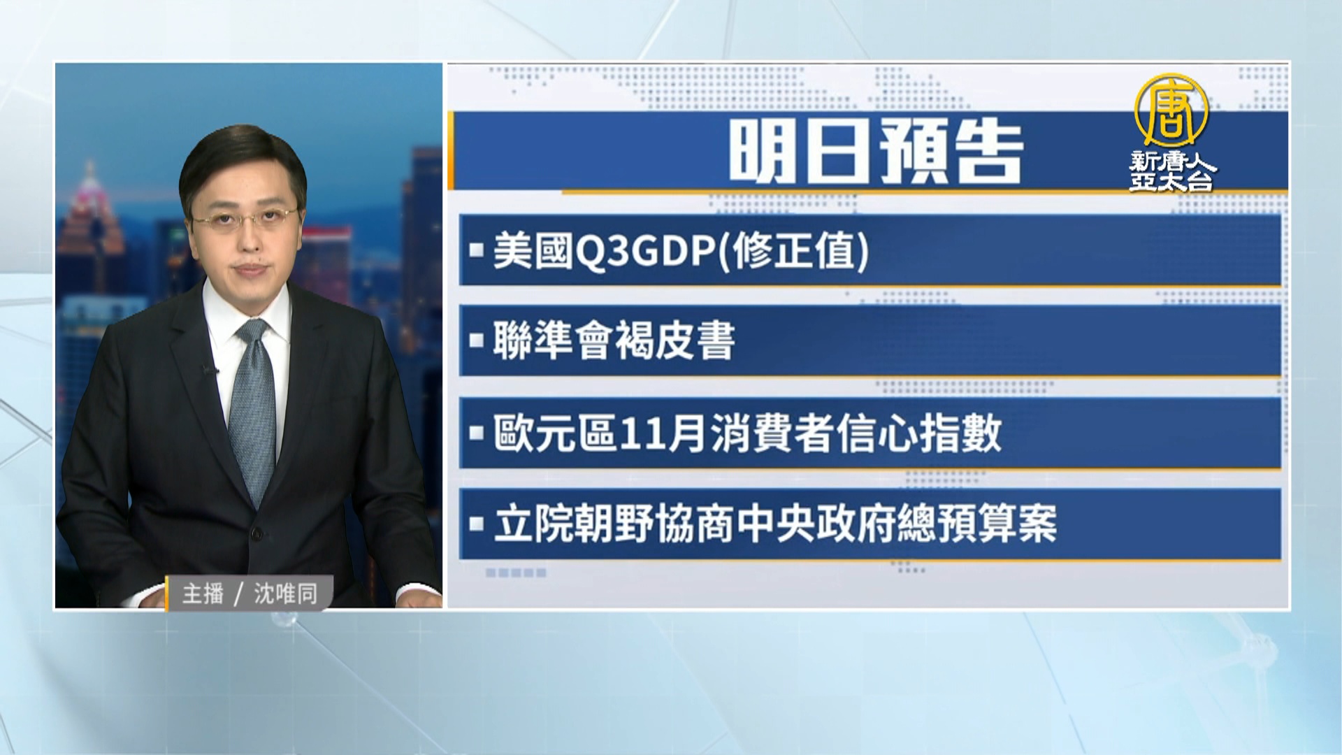 【新唐人亞太台 2023 年 11 月 28 日訊】帶您看到明天,11月29日,星期三,有哪些重要的財經活動。 美國公布Q3GDP(修正值)。美國聯準會公布褐皮書。歐元區11月消費者信心指數。台灣立院朝野協商中央政府總預算案
