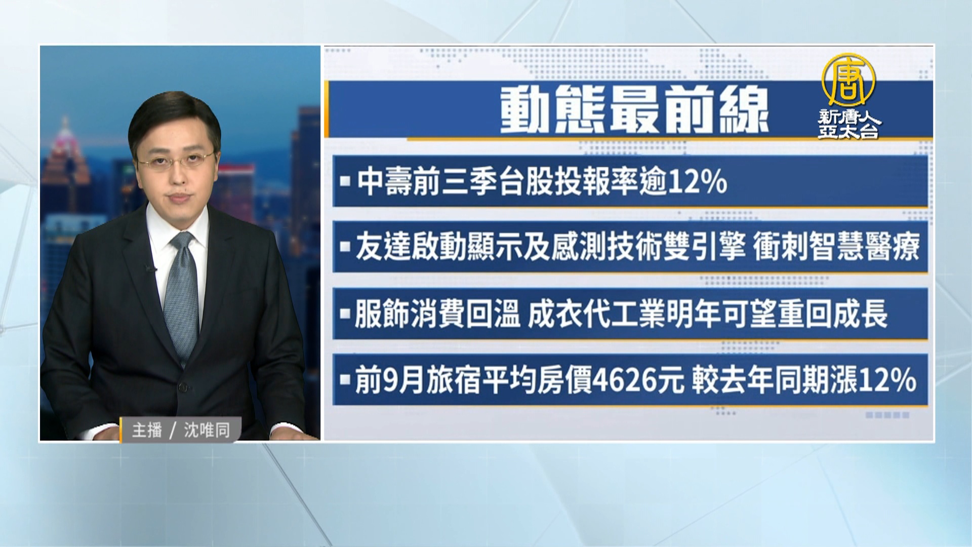 【新唐人亞太台 2023 年 11 月 28 日訊】帶您看到今天產業動態,中國人壽股票及債券市場,實現獲利約119.05億元,其中台股部位投報率高達 12.23%。友達以顯示器事業為根基,延伸醫療顯示技術、高精密度感測技術兩大核心能力,整軍部署智慧醫療商機。國際服飾品牌大廠庫存降低,台灣成衣代工廠指出,谷底已過,訂單能見度到明年第3季。旅宿房價持續上漲,今年1到9月平均房價為新台幣4626元,較去年同期平均房價增加了501元,成長12.15%。