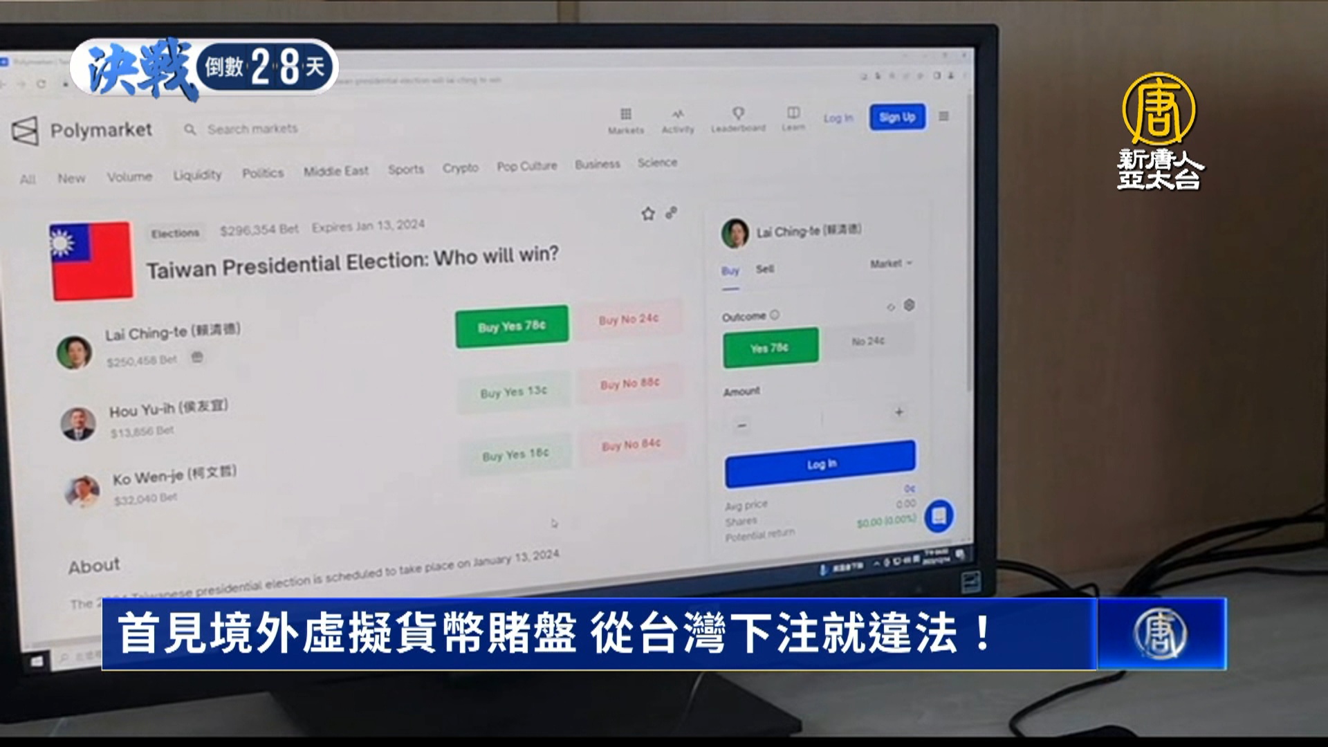 【新唐人亞太台 2023 年 12 月 16 日訊】台灣總統大選倒數一個月,雲林縣警方近期透過網路巡邏,發現一個國外「去中心化預測平台」,開設台灣選舉賭盤,提供民眾以虛擬貨幣下注,清查總賭資已高達31萬美元,約台幣976萬元。