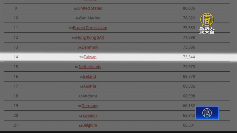 【新唐人亞太台 2023 年 12 月 25 日訊】隨著2023年即進入尾聲,美國知名財經月刊《全球金融雜誌》公布「2023年全球最富裕國家」排名,台灣位居第14,人均GDP為7萬3344美元,約新台幣228萬,擠進世界前20名,超越英國、德國、南韓與日本等國家。而愛爾蘭與盧森堡分別位居第一、第二名,中國則排在第77名。