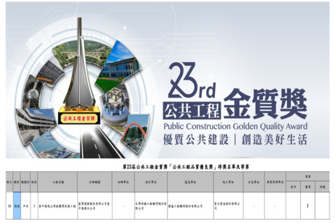 【新唐人亞太台 2023 年 12 月 26 日訊】     112年12月26日,行政院公共工程委員會舉辦第23屆「公共工程金質獎」頒獎典禮,全國共有108件工程參選「公共工程品質優良獎」,得獎68件,其中特優11件、優等28件及佳作29件,由行政院長陳建仁及公共工程委員會主任委員吳澤成頒發各獎項,由臺中港務分公司主辦「臺中港陸上導航疊標改建工程」榮獲設施工程類第三級優等獎殊榮。