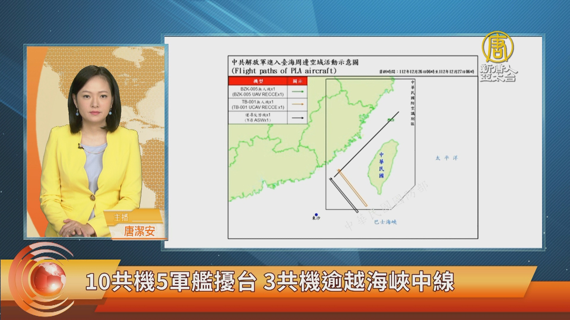 【新唐人亞太台 2023 年 12 月 27 日訊】中共持續派出軍機、軍艦襲擾台灣周邊海空域;中華民國國防部指出,到今天上午6點為止的過去24小時,偵獲共艦5艘次、共機10架次,其中有1架「TB-001」無人機越過台灣海峽中線南段進入台灣西南空域;1架「運8」反潛機進入台灣防空識別區西南空域;1架「BZK-005」無人機越過海峽中線北段,進入台灣北部空域。