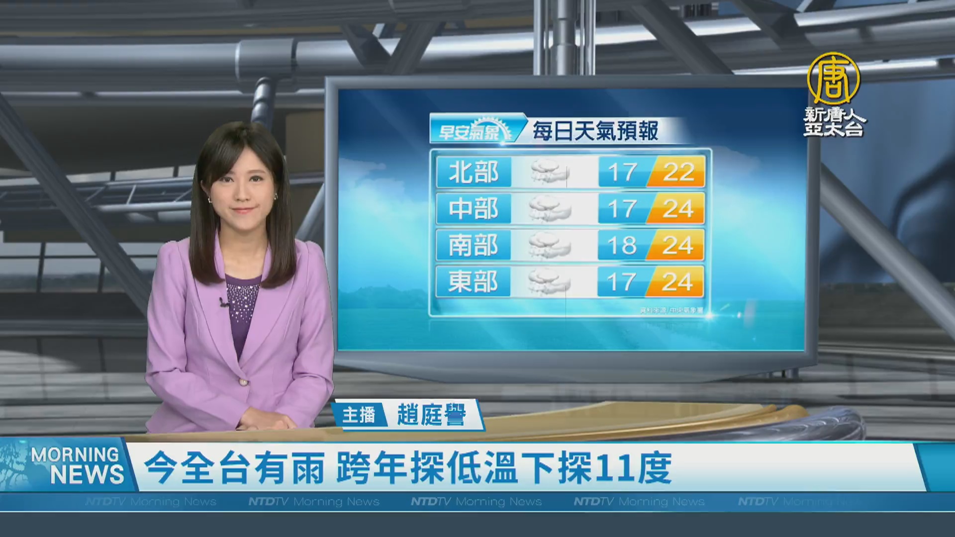 【新唐人亞太台 2023 年 12 月 28 日訊】歡迎您收看12月28日的早安新唐人,我是趙庭譽,先來帶您關心天氣。今天全台有雨,雨勢到晚上才會慢慢減緩;明天受東北季風影響,北部、東半部仍然容易下雨,另外,跨年夜、元旦預估將有一波強度逼近大陸冷氣團的冷空氣抵達,低溫下探11度。帶您一起來看到國際媒體重要訊息。