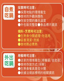 許淑真副教授也提醒,在備料部分,生熟食要分開處理、肉片薄切較好煮熟、海鮮外殼需仔細刷洗、蔬菜以流水仔細清洗數次、包心葉菜的最外層葉片丟棄不食用。另外,如鍋內加入雞蛋,也記得要煮熟,並建議使用國產CAS洗選蛋,因為經過洗選後,蛋殼表面微生物菌數會減少很多、更加安全,使用前也需再次洗蛋與洗手。