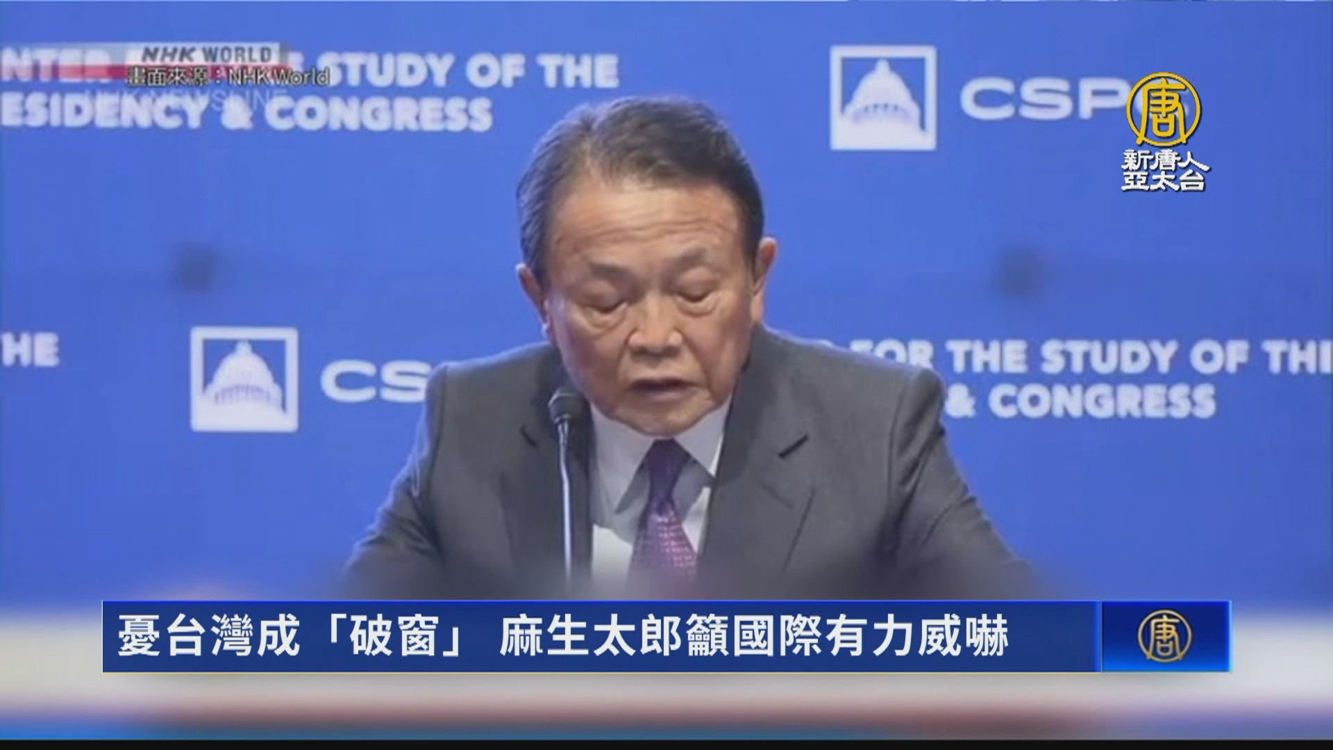 【新唐人亞太台 2024 年 01 月 11 日訊】台灣大選國際關注。目前人正在美國訪問的日本前首相麻生太郎,在智庫發表演說時表示,烏克蘭與加薩的衝突可能會蔓延到台灣。他引用犯罪學的「破窗」理論,表示如果一扇破窗不予修復,會有更多窗戶被打破,最終整個城市將被摧毀。