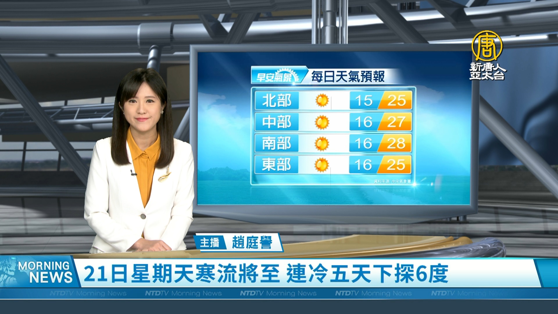 【新唐人亞太台 2024 年 01 月 18 日訊】歡迎您收看1月18日的早安新唐人,我是趙庭譽,先來帶您關心天氣。今天的天氣與昨天類似,明天週五入夜後預計會有鋒面接近,週六可能全台有雨,另外,入冬最強寒流在週日報到,氣象署預估溫度會一路下滑,最低溫恐怕還會下探到6度。帶您一起來看到國際媒體重要訊息。