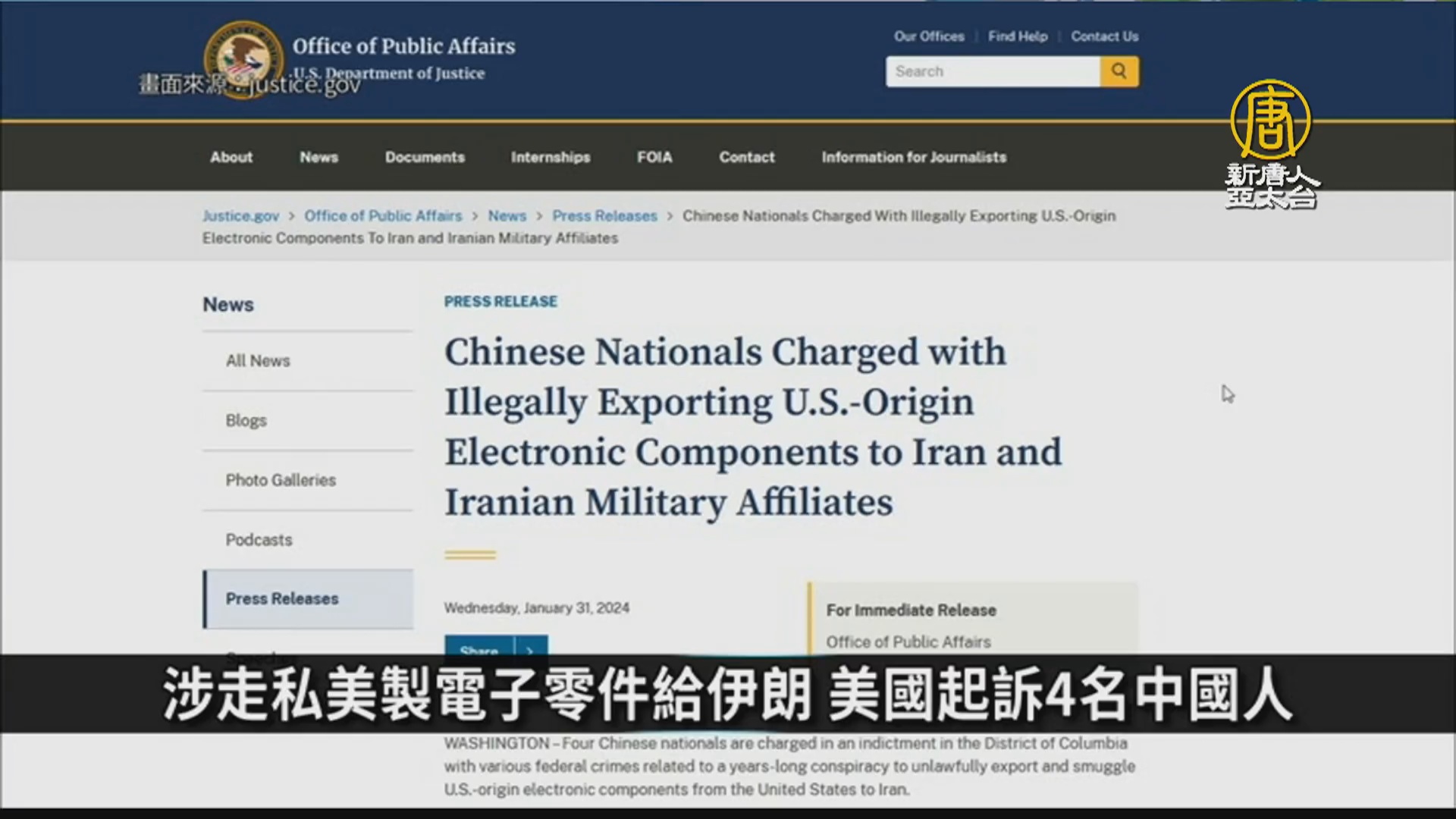 美國司法部1月31日表示,美方以涉嫌走私包括一些可能具有軍事用途的美製電子零件給伊斯蘭革命衛隊和伊朗國防部遭制裁的附屬實體的罪名,起訴4名中國人。美國已對這些被告發出逮捕令。