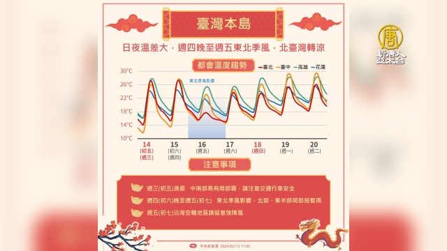 【新唐人亞太台 2024 年 02 月 15 日訊】歡迎您收看2月15日的早安新唐人,我是趙庭譽,先來帶您關心天氣。今天是大年初六開工日,今天白天各地為多雲到晴、高溫約在25度至28度左右,不過,今天晚上開始,鋒面通過及東北季風增強,北部地區將轉為局部短暫雨,而明天北台灣白天高溫只有18度,降幅達10度,提醒觀眾朋友留意保暖。帶您一起來看到國際媒體重要訊息。