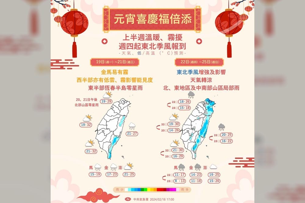 週四(22日)鋒面通過東北季風增強,北東地區、中南部山區降雨機率增,北台灣漸轉涼;週五(23日)起東北季風影響,北東地區、中南部山區降雨機率較高一些,北台灣較涼,其他地區也略轉涼。週四北台灣白天高溫略降,北部、宜蘭、花蓮高溫約25~26度,中南部高溫約30度,台東高溫約27度。