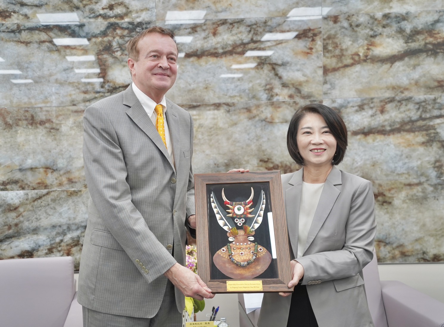 今日拜會中,歐賀曼處長特別贈送為縣長周春米特別製作的水晶飾品,而縣長周春米則回贈了原住民頭飾圖框與屏東冠軍可可巧克力,期待歐賀曼處長的駐台任期將為台灣與奧地利的經貿友好關係帶來新亮點。