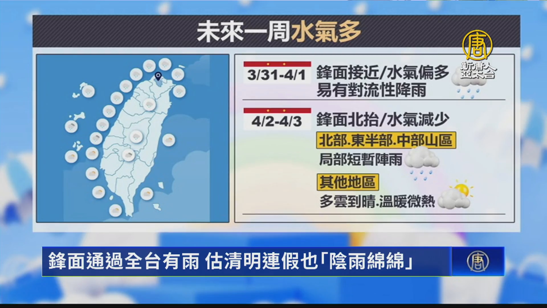 因為對流雲系發展旺盛,週末2天鋒面接近,水氣偏多,容易有對流性降雨,週二、週三雨勢趨緩,只有東半部及中部以北山區會有局部短暫陣雨。其他地方則是多雲到晴溫暖微熱的好天氣。但是到了週四、週五,也就是清明連假開始,又會有新一波的鋒面接近,當時北部東半部和中山區又會是陰雨綿綿。