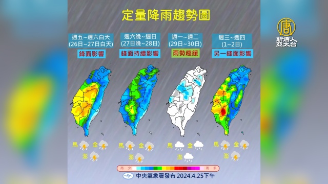【新唐人亞太台 2024 年 04 月 26 日訊】歡迎您收看4月26日的早安新唐人,我是趙庭譽,先來帶您關心天氣。受到鋒面影響,氣象署指出,中南部地區,今明兩天有局部豪雨發生的機率,請民眾注意。另外,昨天25日累積到晚間八點為止,高雄市新興區的降雨量已經達到154毫米,台南安平的累積雨量也達85毫米。氣象署表示,這波鋒面會一直持續影響台灣到星期天(28日),而從下個禮拜一之後,降雨將會緩和。帶您一起來看到國際媒體重要訊息。