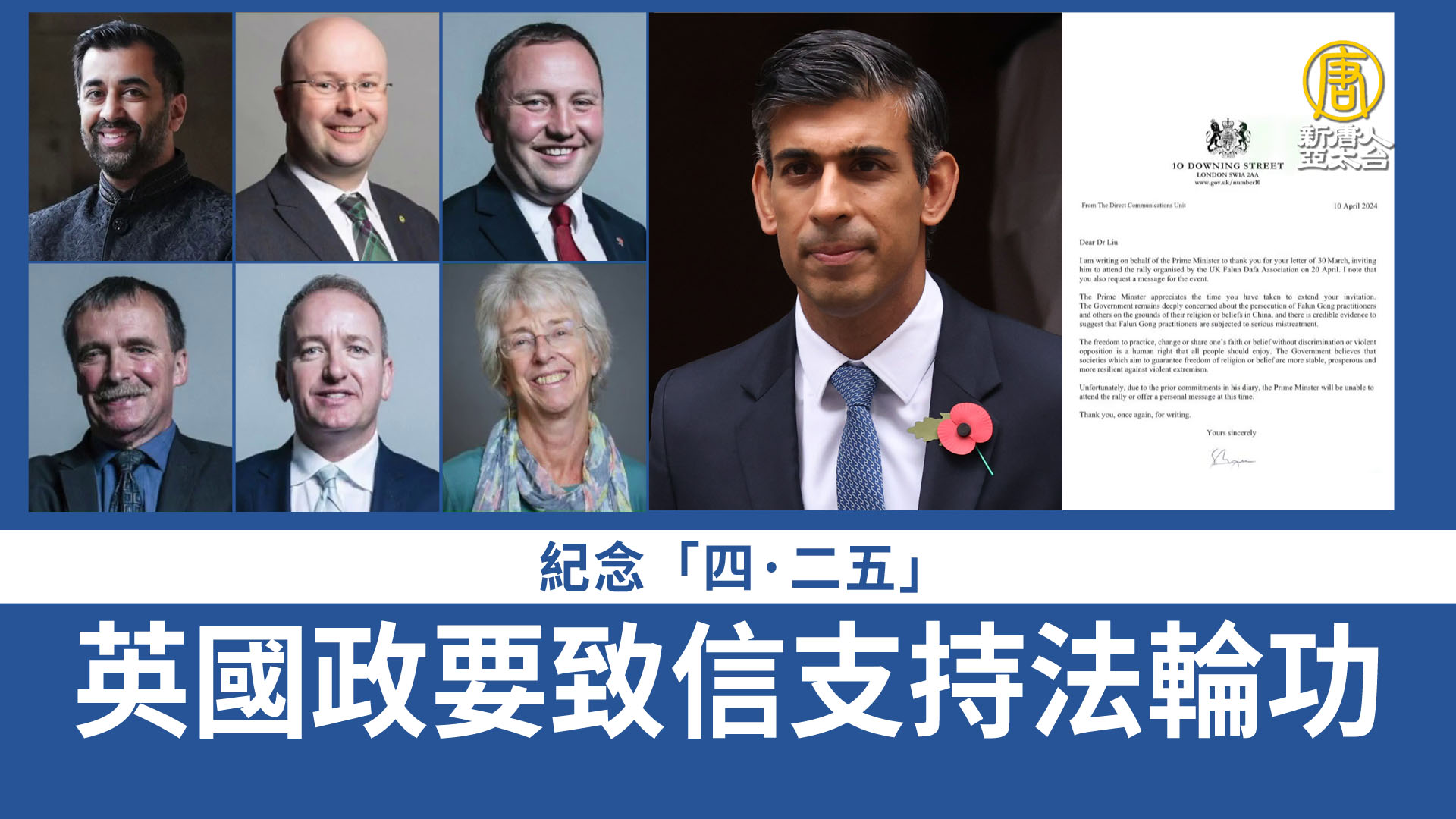 【新唐人亞太台 2024 年 04 月 27 日訊】法輪功學員萬人和平上訪二十五週年之際,英國首相蘇納克辦公室、蘇格蘭首席部長尤沙夫辦公室,以及英國上下議院的多位議員,紛紛發出信函,表達對法輪功的支持。