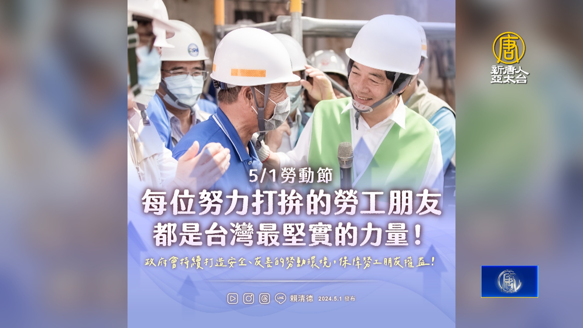 2024-05-01 20:11:5651勞動節,總統蔡英文、副總統賴清德分別向勞工朋友致意。蔡英文社群媒體發文,向每一位勞工朋友說「辛苦了」,列舉各項政策,包括基本工資調漲、最低工資法上路等,持續提升勞工權益。賴清德也在中常會中說,民進黨一直與勞工朋友站在一起,致力打造尊嚴勞動、友善職場。