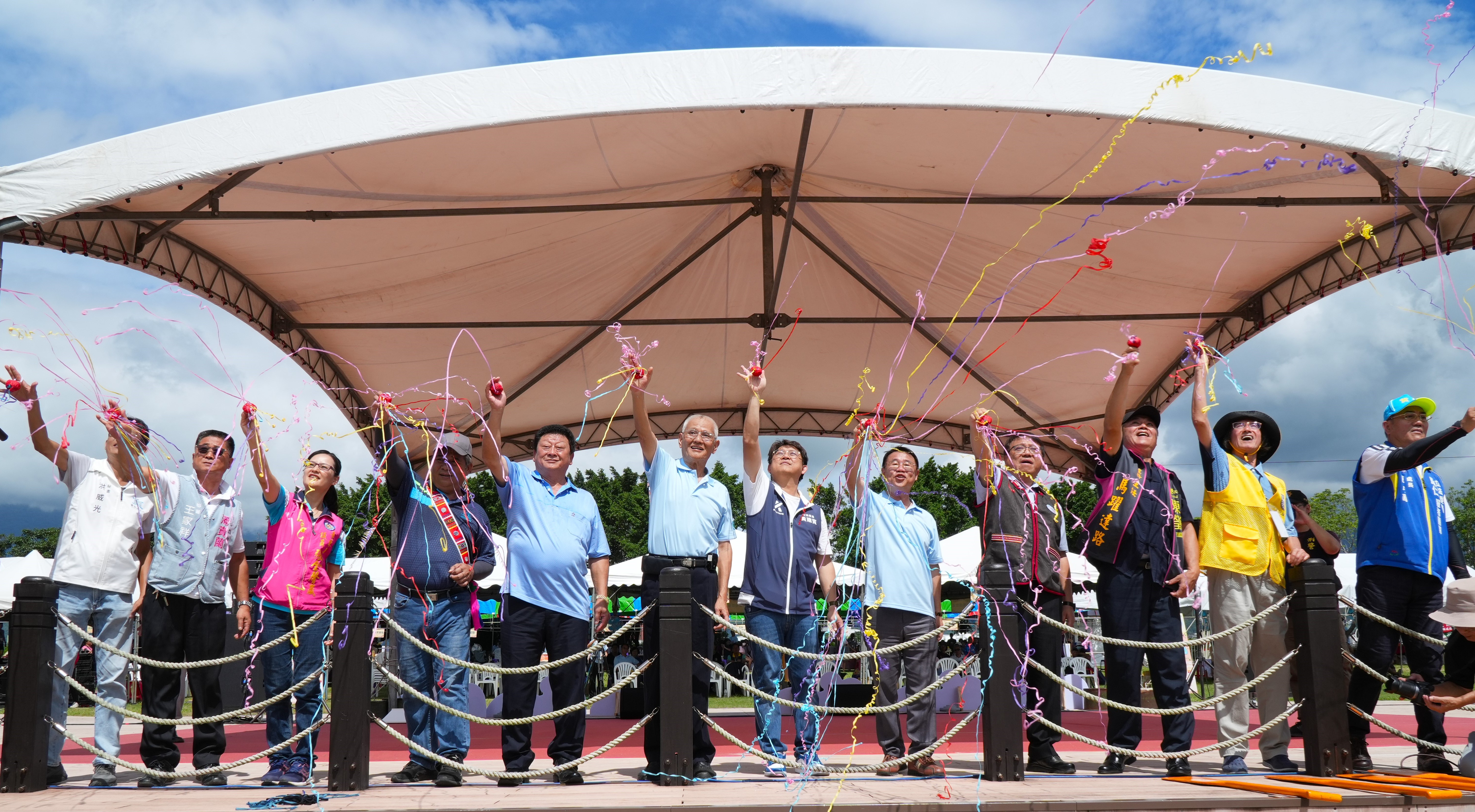 2024年6月1日,台東「池上划很大」竹筏季在大坡池登場,池上鄉長林建宏與貴賓一起為比賽開幕。(圖/池上鄉公所提供)