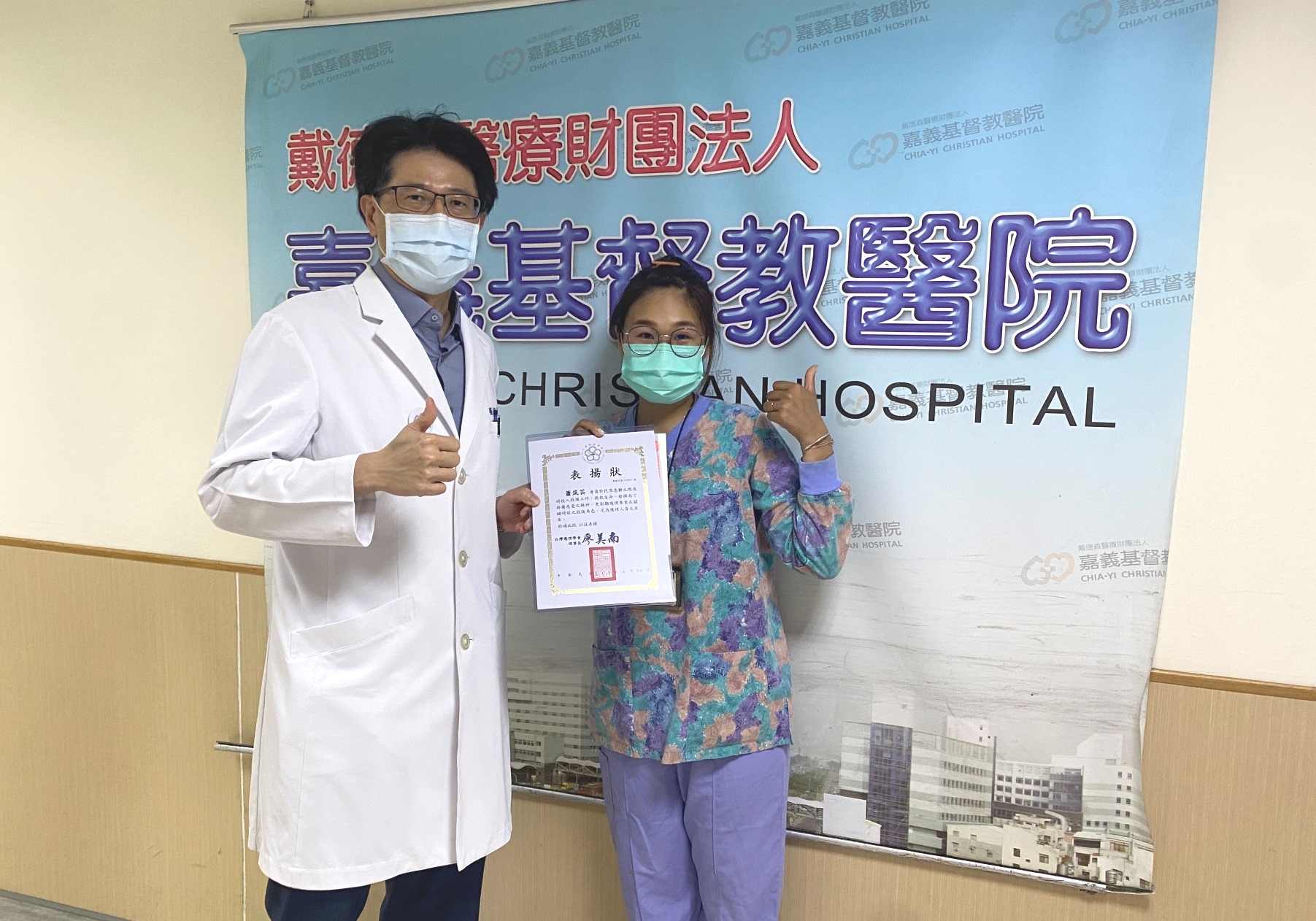 嘉基院長陳煒特地將台灣護理學會頒發之表揚狀,送到蕭筑云手中。(嘉基提供)