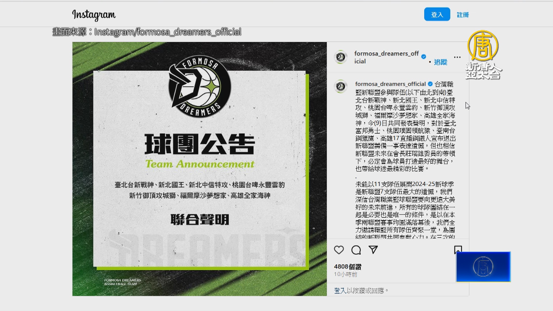 【新唐人亞太台 2024 年 07 月 10 日訊】台灣新職籃聯盟正式公布命名,為台灣職業籃球大聯盟,簡稱TPBL,7支隊也正式發出聯合聲明說,未能以11支隊伍展開新球季是新聯盟7支隊伍的最大遺憾,聯盟強調,會堅定打造台灣最好職業籃球舞台的決心,而原訂15日登場的選秀會,將延期。