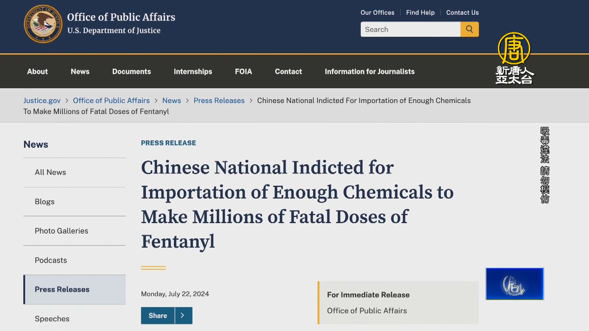【新唐人亞太台 2024 年 07 月 24 日訊】美國司法部週一宣布,起訴一名中國男子方敏肅,他涉嫌走私大量「芬太尼前體」,來看詳情。