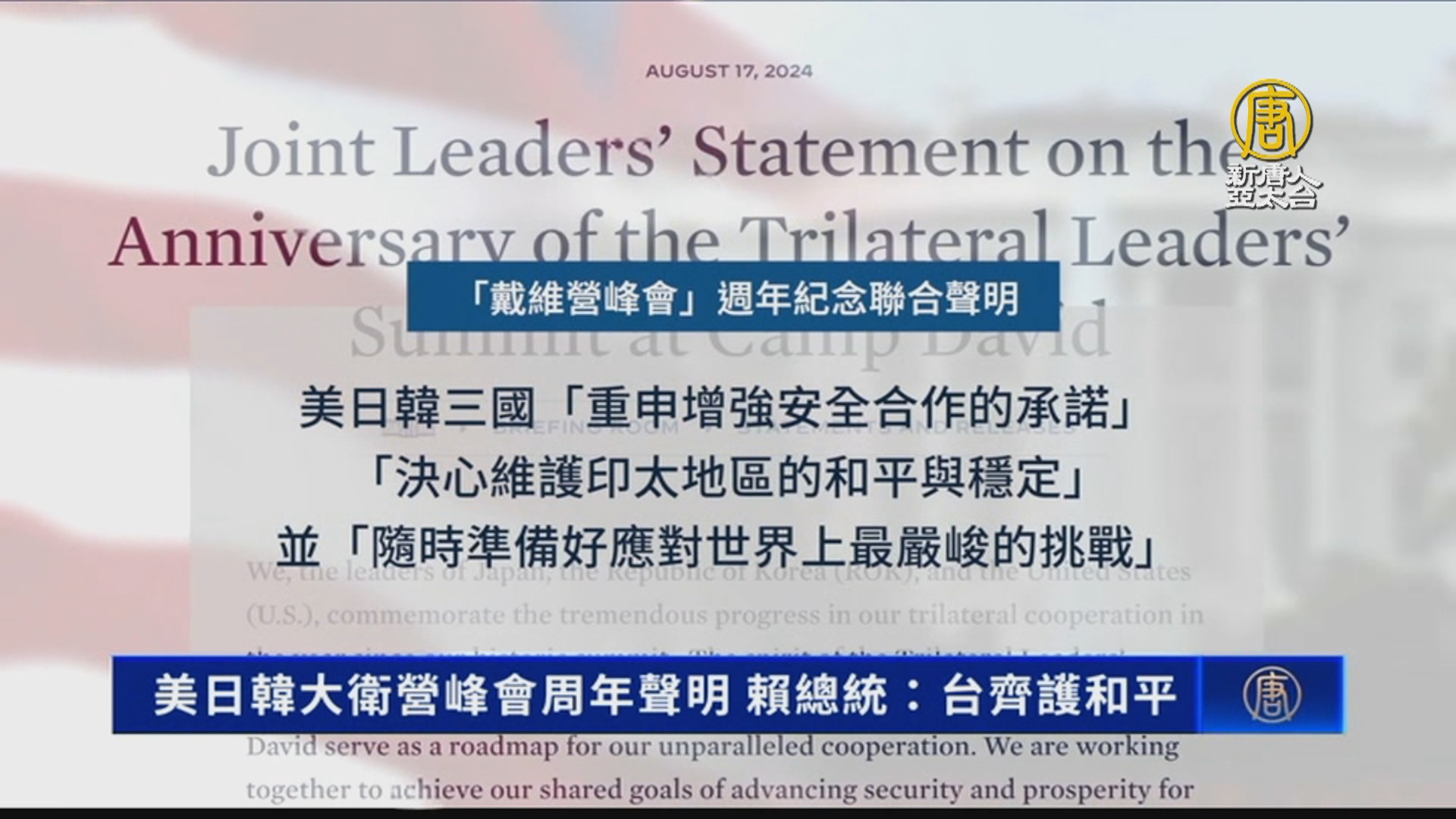 【新唐人亞太台 2024 年 08 月 19 日訊】再來看到,星期天是美日韓「大衛營峰會」一周年紀念日,三國領導人發表聯合聲明,重申維護印太和平、共同應對地區挑戰的承諾。總統賴清德昨晚發文表示感謝,強調印太和平穩定是共同的責任,台灣致力於與全球夥伴一起守護,共享的願景讓台灣更堅強。