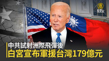 【新唐人亞太台 2024 年 09 月 30 日訊】再來關心,美國白宮(29日)宣布,對台灣提供最高5.67億美元的軍事援助,大約新台幣179億元,是美國史上最大筆的對台援助計劃。將為訓練、庫存、反裝甲武器等提供經費,品項還包含無人機,是不對稱戰略的關鍵。上週,中共公開試射洲際彈道飛彈,學者建議,台灣應該積極與他國共享飛彈預警的資訊,達成共同的安全利益。