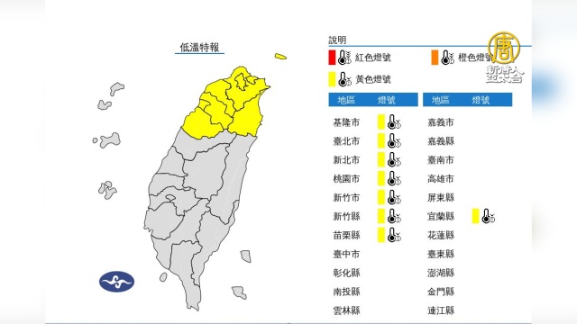 中央氣象署清晨6時32分針對新北市、基隆市、台北市、桃園市、新竹市、新竹縣、苗栗縣、宜蘭縣等8縣市發布低溫特報,到今天上午恐10度以下。